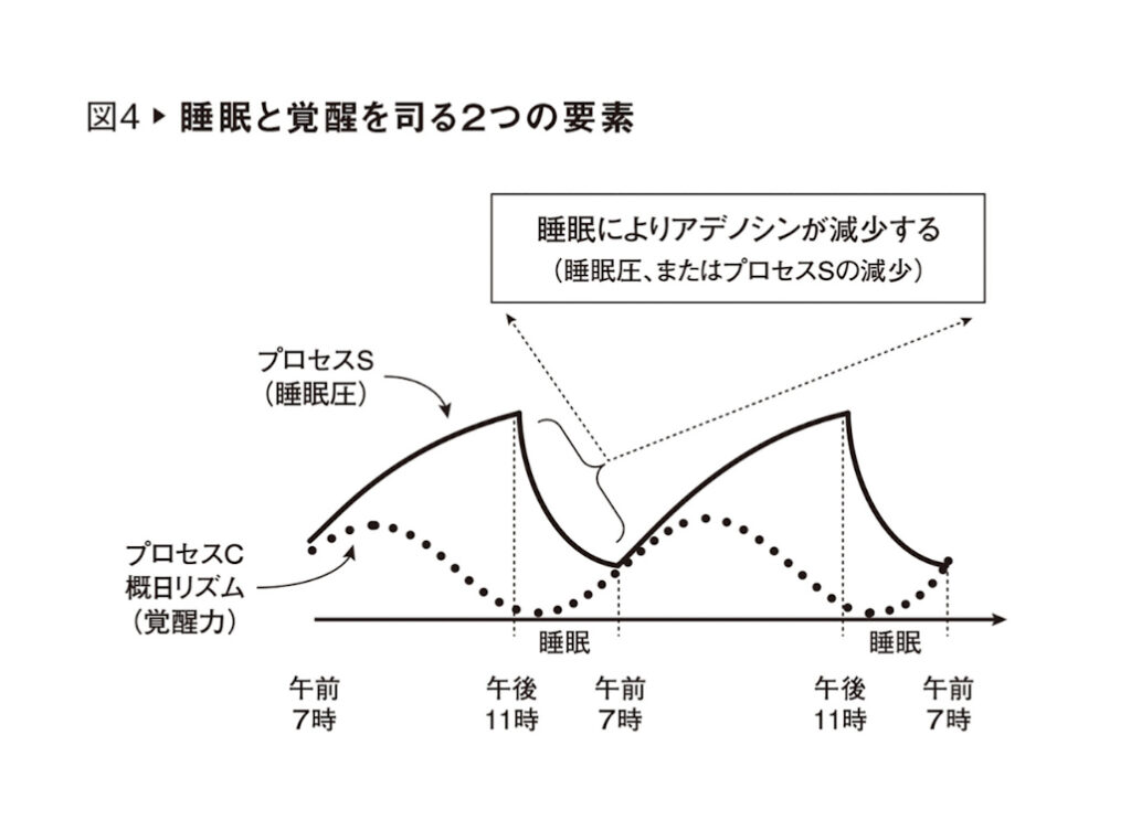 1つは、視交叉上核が司る 24時間単位の概日リズムであり、もう1つはアデノシンから送られる睡眠圧だ。