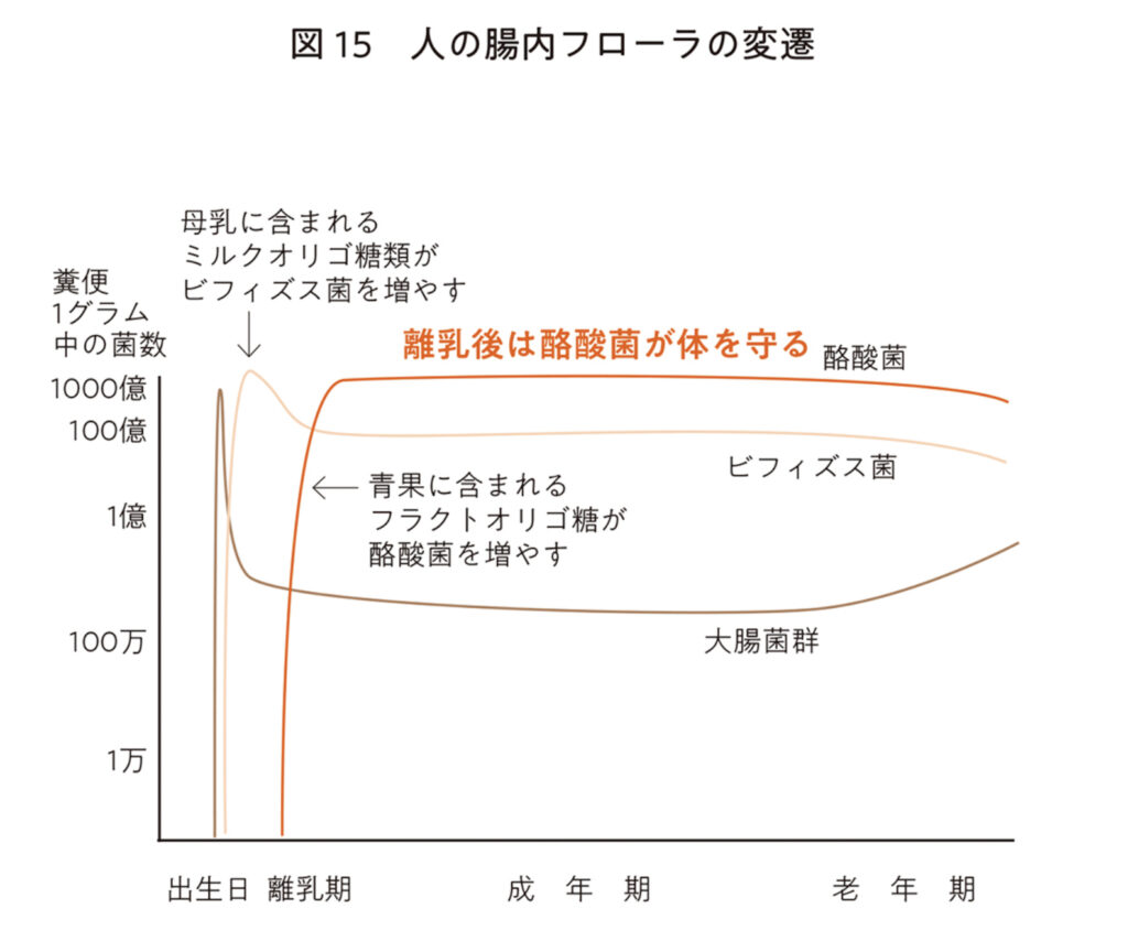 つぎに、私たちの誕生、成長、老化の過程における腸内フローラの変化について説明していきます(図 15)。