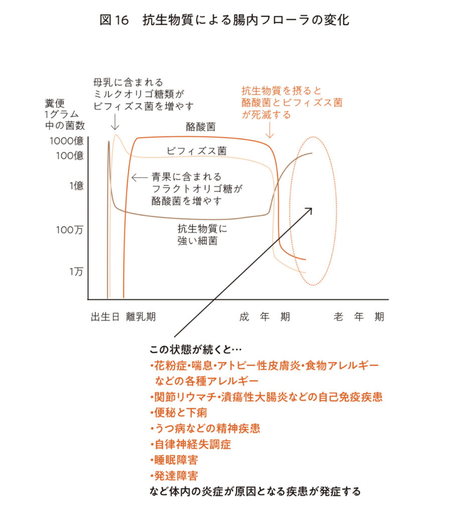 抗生物質を摂ると、腸内フローラの攪乱により、花粉症、喘息、アトピー性皮膚炎、食物アレルギー、関節リウマチ、潰瘍性大腸炎、うつ病、自律神経失調症、睡眠障害、発達障害などが起こります。