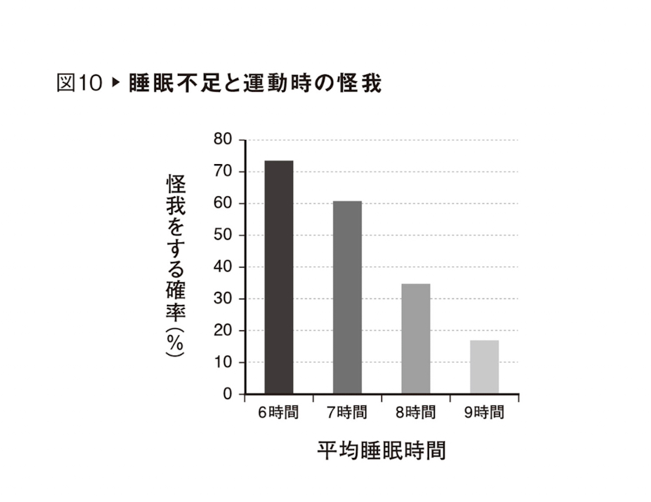 図 10を見れば、シーズン中の慢性的な睡眠不足が、怪我のリスクを大きく押し上げていることがわかるだろう。