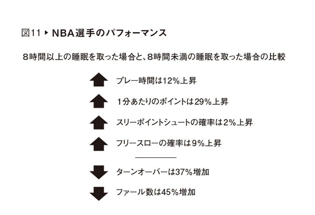 夜の睡眠が 8時間より短くなる、とくに 6時間を切るようになると、さまざまな問題が生じる。たとえば、肉体が疲労するまでの時間が 10 ~ 30%短くなる。心肺機能も著しく低下する。四肢を伸ばす力と垂直跳びの高さも低下する。筋力のピークが下がり、筋力を維持する力も下がる。それに加えて、心血管、代謝、呼吸機能も低下し、筋肉に乳酸がたまるのが早くなる、血中酸素飽和度が下がる、血中の二酸化炭素が増えるといった悪影響が出る。また睡眠不足は、運動時に汗をかいて身体を冷やす機能までも下げてしまう。これはピーク・パフォーマンスを実現するうえで欠かせない機能だ。