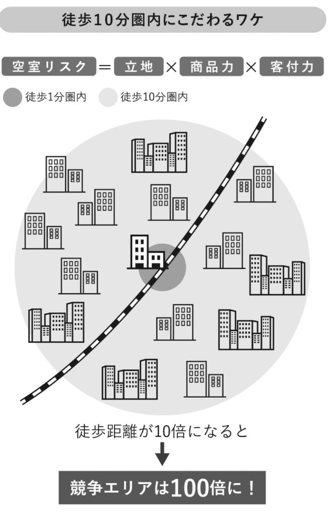 単純に考えて、徒歩 1分の物件と徒歩 10分の物件では 100倍もの競争率(入居者からの選ばれやすさ)の違いがあるのです。