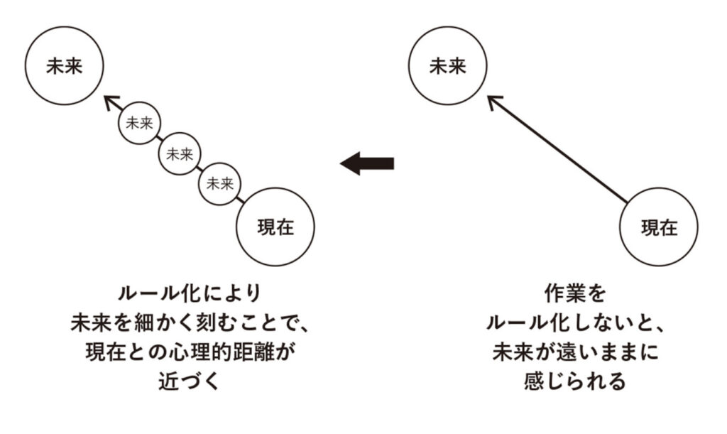 期日がない仕事でもあえて「今日の 10時までにやる」と決めれば未来の姿が明確になり、やはり現在との心理的距離が縮まります。