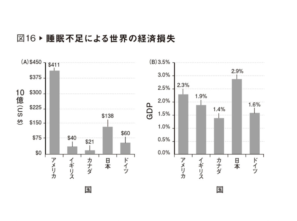 図 16の Aを見ればわかるように、睡眠不足によって、アメリカは 4110億ドル、日本は 1380億ドルの損失を出している。この 2ヵ国に続くのが、ドイツ、イギリス、カナダだ。