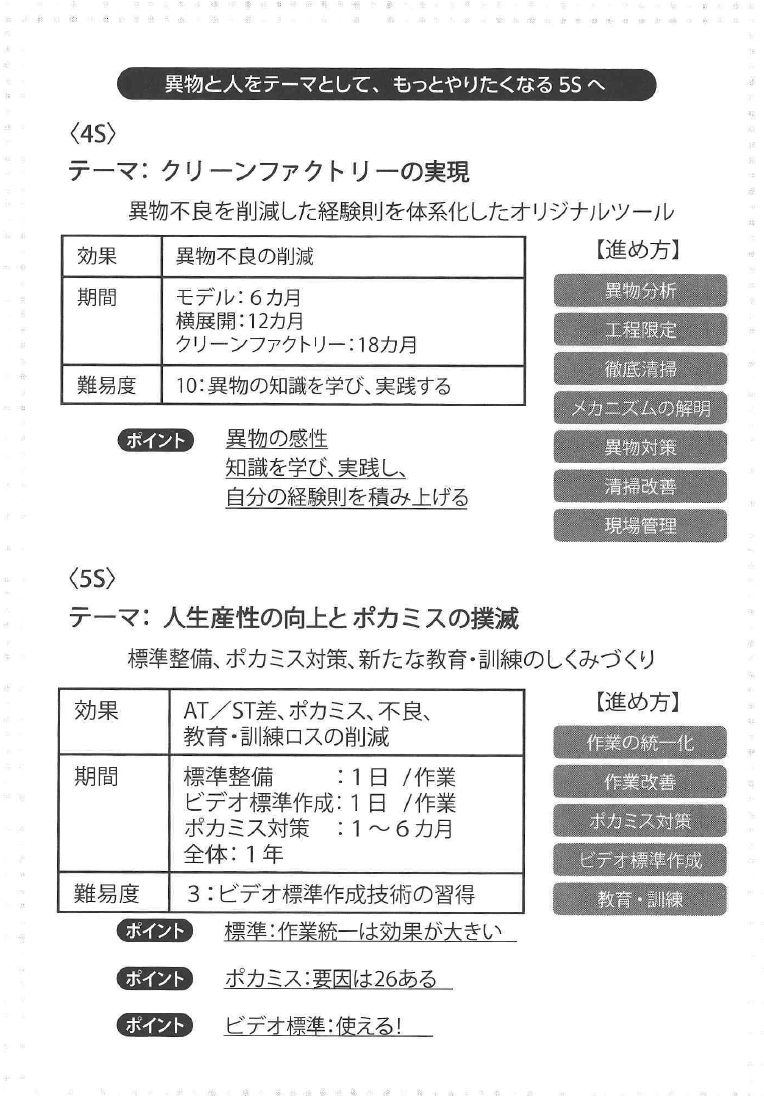 具体的には、2Sでは更地化(本編で詳しく説明します)、3Sでは原則整備へのアプローチ、4Sでは異物ゼロヘのアプローチ、5Sでは標準整備、ポカミス対策、ビデオ標準へのアプローチを組み込みました。