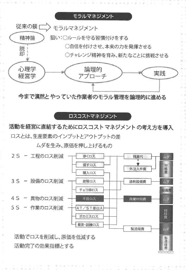 モラルマネジメントは、5S活動と普段の仕事を通してルールを守り、やる気とチャレンジ精神を持った人材を育てる手法です。