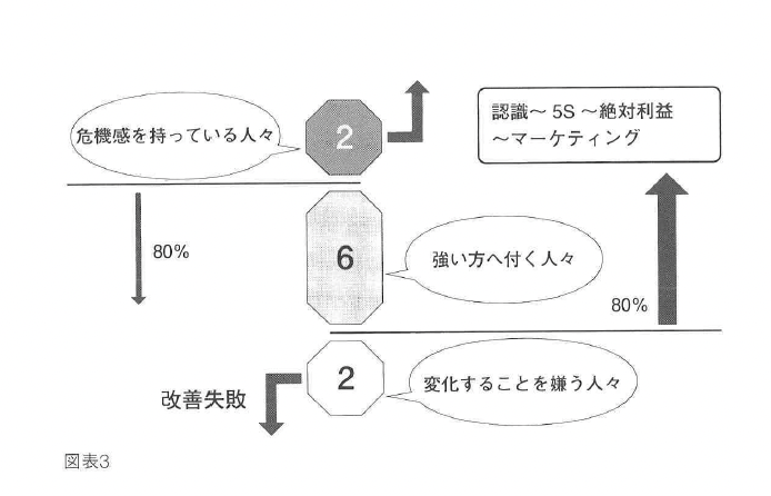 どこ の企業にも必ず「このままではいけない」と いう危機感を持った人たちがいます。経営者 はそうした上の2割の人たちとどうにかして 組織を活性化しようと努力をしています。し かし、そこにはある種の誤解あります。 「専務や筆頭部長たちは危機感を持っていて くれるが、残りの社員はそうした危機感が薄 い。彼らを何とかしなければならない」 と経営者は考えてしまうのです。 そして、朝礼や会議など折に触れて「君た ちには危機感が足りない―」と6割の人たち に熱心に語りかけます。彼ら、すなわち6割 の組織に無関心な人たちの変化を促進しよう とします。しかし、この人たちがなかなか変 わってくれません。ある意味、この人たちは無関心ではないが受け身の人たちなので、自分たちからは積極的には動かず、経営者から するとイライラする存在でもあります。そのイライラが高じて、時に大声になってしまう こともあるかもしれません。 実は、6割の人たちは強い人(仕組み)につくという性質を持っています。よって「上 の2割の人たち」が強くなれば、この6割の人たちは動き出すのです。6割の人たちも、 会社の行末や自分たちの生活に無関心なわけではありません。本当は胸の奥底で「このま まで大文夫だろうか」と考えているのです。そこで、上の2割の人たちが、5S活動を 開始して全社を巻き込みます。すると、6割の人たちも同じ方向を向くようになります。 つまり、プロジェクトを通じて「8 ¨2」を作ることができれば、間違いなく組織は大き く動き出しますc そうなると、残りの「変わりたくない」と思っている2割の人たちも動きます。「8 ¨ 2」という比率は、組織においては抵抗者が出てこない比率です。 例えば、休日に会社のために一斉清掃を行ったとします。10 人中8人が熱心に動きてい るときに2人では腕を組んで何もしないわけにはいきません。少々抵抗感があっても全体 の8割の動きに従います。 逆に、組織にとってもっとも危険な比率とは「6 ¨4」です。組織の大勢が「6 ¨4」になると4割の人たちは腕組みをして手を止めてしまいます。 なぜならば、活動に批判的な仲間がある程度いるので、熱心に動こうとする人たちに対 して、お手並み拝見とばかりに手を止めて動こうとしないのです。5S活動のようなプ ロジェクトに取り組む際には、「6 一4」の状態を作ってはいけません(この「6一4」の 比率を私は「悪魔の比率」と呼んでいます)。 また、最初から「変化することを嫌う、あるいは反対する」という2割の人たちを切り 捨ててもいけません。 以前ある組織で社長が苛立ってこの2割の人たちを辞めさせたことがありました。そう すれば組織が素早く変化できるのではないかと考えたのですが、すぐに6割の中から下の 2割の人たちが現れてきて苦労したという話を聞きました。つまり、組織の人たちの意識 を変えるということは、単純にその人たちが持っている性格や資質によるものではなく、 組織の枠組みや変化させる手順があるのだということを理解しておく必要があるのです。