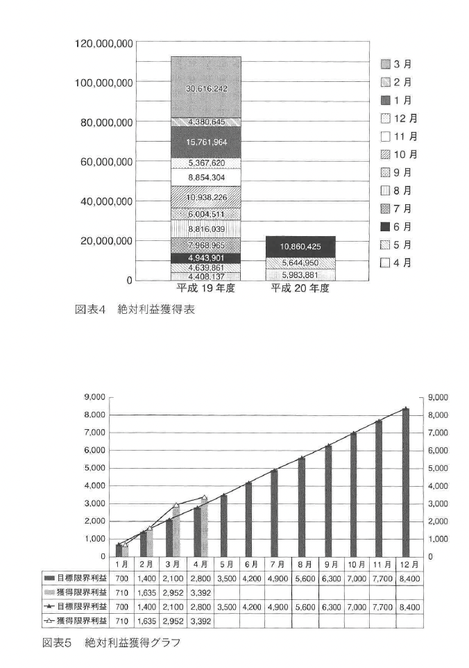 企業組織の利益の考え方にはいろいろなものがありますが、われわれはもっともシンプ ルな考え方として「絶対利益」というものを組織で考えていただいています。 組織には「仕事があってもなくても絶対に必要な金額」というものがあります。 例えば、人件費はもっともわかりやすい費用でしょう。同じように、地代家賃、光熱費、 車両に関する車検や保険費用、毎月のリース費用、 一般管理費の多くのものは、仕事の有 無(売上の有無)にかかわらず、組織にとっては絶対に必要な金額で一般的にそれらは固 定費と呼ばれます。また、多くの中小企業は金融機関からの借入れをしていると思います のでその返済金額も該当します。さらに、予定納税の積立て、採用や設備投資のために利 益が必要になってきます。整理して書くと次のようになります。 固定費+金融機関への返済金+税金の積立金額十税引き前利益=絶対利益もしかすると、初めてご覧になる数式かもしれません。特に、金融機関への返済金と固 定費が並立しているので、ご指摘をされる方もいらっしゃるかもしれませんが、実はこの 式によって出された金額を集めることが組織の存続を保証すると同時に、全社員にもっと もわかうやすく利益を理解させるものなのです。 例えば、会計上には「売上総利益」「経常利益」「営業利益」「税引前当期純利益」「純利 益」という5つの利益がありますが、この中のどれを社員に教えたらいいのでしょうか。 会計士から利益教育を受ける企業もありますが、 一般社員に「減価償却費」「租税公 課」「法定福利費」などと教えても、ほとんど理解できません。だったら「仕事があって もなくてもこの金額が必要だ―」という金額を全員に教えたほうが、よう現実的です。何 しろ、この金額の中には自分たちの給料やボーナスが入っているのです。シンプルに利益 の説明をすると、世代や職位にかかわらず、アルバイト・パートの人たちまで充分に理解 できます(詳細は後述します)。 少し角度を変えて考えると、その金額の総額を組織全体で集めてしまうと、企業は潰れ ないことがわかります。企業が倒産する理由は、売上不振や利益圧迫などさまざまな要因が重なりますが、逆に考えれば、この絶対利益を集め切れなかったからという一点に帰結 します。 5S活動の最大の特徴は全員で取り組むということにあります。そして、組織が必要 とする利益もまた全員で集めなければなりません。 絶対利益についての金額は、残念なことに決算書の中には書かれていません。これは、 経営者自らが自分自身の体を点検するように、自ら費用や金額を計画、設定することから しか把握できません。これは、ある意味「経営計画」の第一歩なのです。そして、この金 額を確定させることができれば、組織全体にこう問いかけることができます。 「弊社では、仕事があってもなくてもこの金額が絶対に必要だ―・だから今度から……」 次ページのグラフは、5S活動とともに「絶対利益獲得金額」を毎月全社に公表して、 利益獲得の進捗を全社で共有しているものです(図表4、5)。