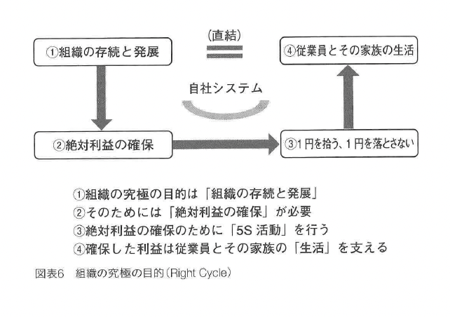 れることがありますが、中小企業の場合には誰も助けてくれません。必死になって日々の 業務に励まなければならないのは、絶対利益を確保するという理由からなのです。 そして、その絶対利益を確保するために「1円を拾う仕組みの5S活動」「1円を落と さないための5S活動」が存在します。実はこの部分が、5S活動が継続できるか、そ の後も維持できるかの分岐点です。多くの組織が「社長がやれと言っているのでやってい る」という受け身の活動や利益に直結する活動であるという意識のないままに動いている ので、活動が停滞したう場合によっては消滅してしまうのです。 最後にその活動で獲得したお金は、従業員たちの生活に還流します。生活とは、その組 織に属している人たちだけではなく、その人たちの配偶者や子ども、親などという家族の 安心のことです。つまり「組織の存続と発展」は自分たちの生活と直結しているのです。 この循環のことを「″”F のヽo庁(正しい流れ)」と呼んでいます。そしてこの流れは、言葉 で説明しても組織には浸透しません。5S活動というプロジェクトを通してしか、全社 員には理解されないのです。