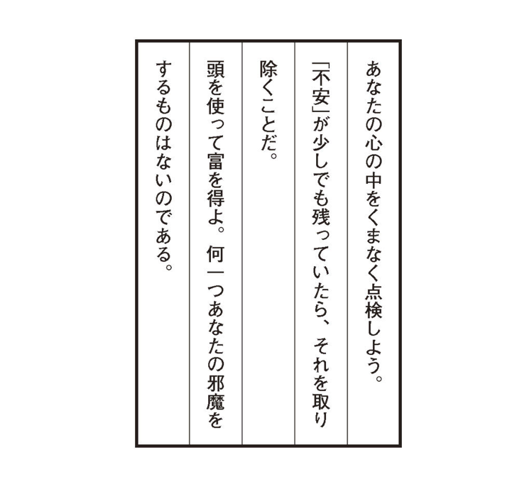また、不安は個人的魅力を失わせ、思考力を破壊し、集中力を低下させてしまう。忍耐力を弱め、意思の力を無力にし、大志をくじき、記憶をいい加減にさせるのも、不安の感情なのである。