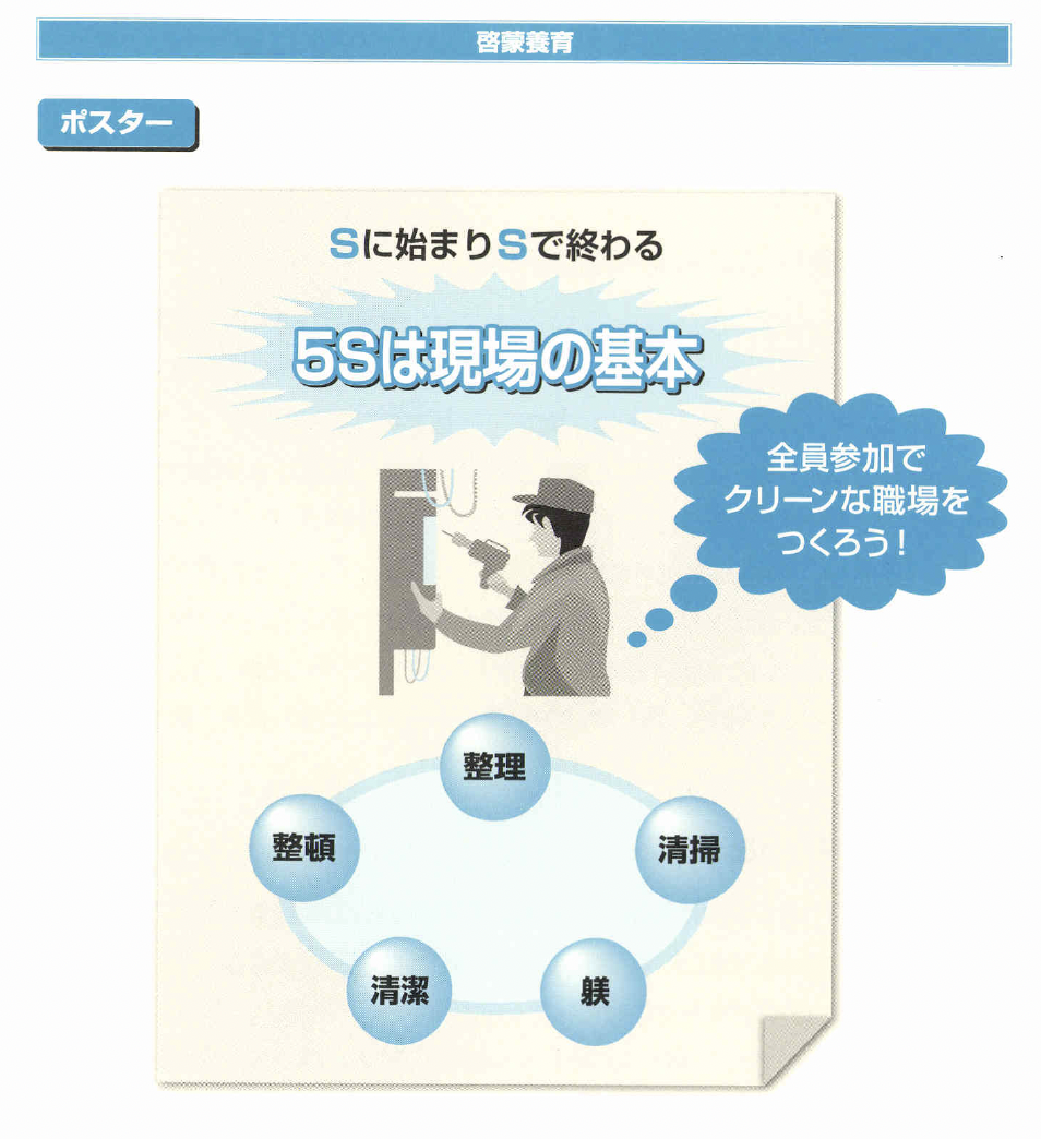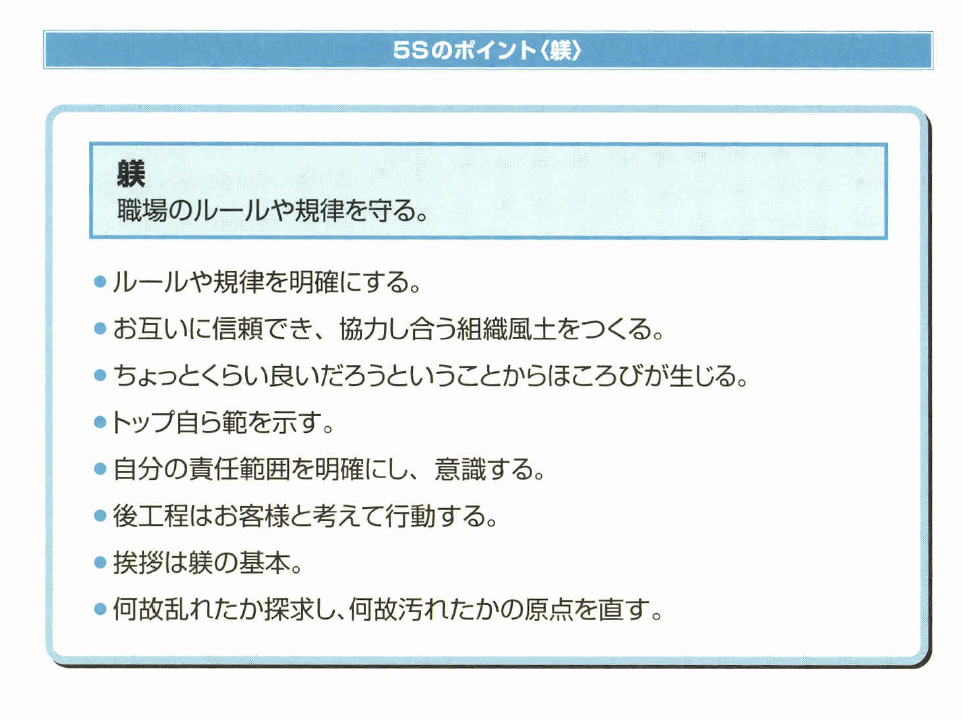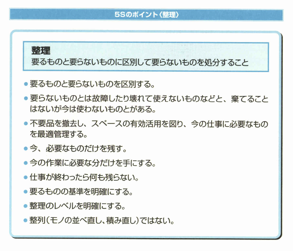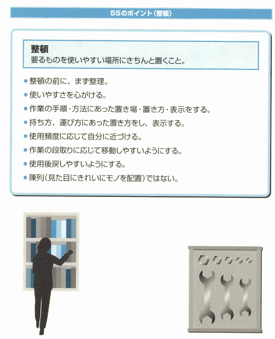 例えば、工具の整理・整頓で必要な工具がひと目で整えられた状態ができたとしても、工具を使つた人が元の場所に戻さなかったり、そのまま使いつばなしにしたりしたのでは、次に使おうとした際、探さなけねばなりません。