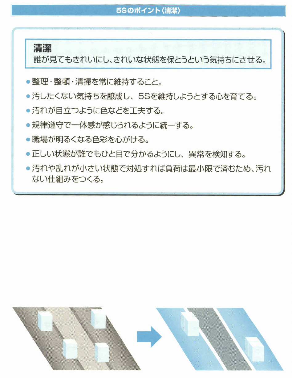 清潔とは、整理・整頓・清掃を維持する活動であり、誰が見てもきれいで、きねいな状態を保とうという気持ちにさせることです。