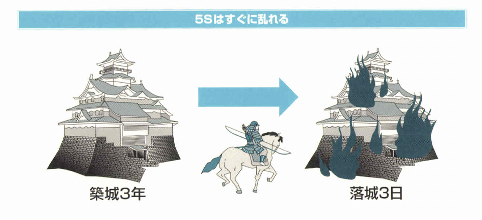 次の5S改善手順は、5Sの定着です。「築城3年、落城3日」の名言もあるように、折角時間をかけて5Sをつくり上げても、崩れ始めるとあつという間に元に戻ってしまいます。