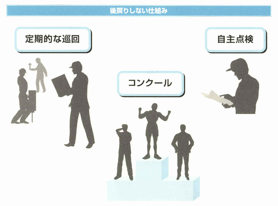 過去の失敗事例を織り込みなが生5Sチェックリストを用いた定期的な巡回や自主点検、コンクールなど後戻りしないような仕組みをつくります。