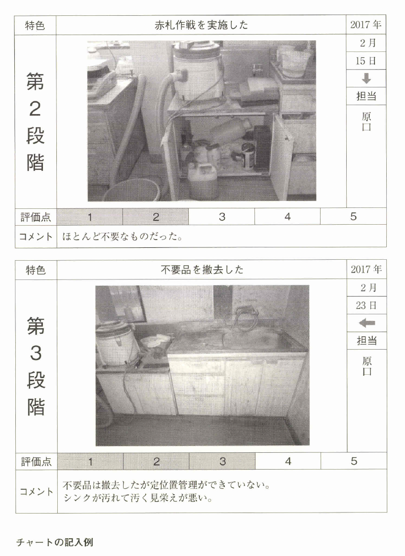 定点撮影チャートは5Sの進み具合を時系列で確認できる。特に改善の間隔があいた場合、その理由を聞いてみると、そこに苦労した点があるかもしれない。