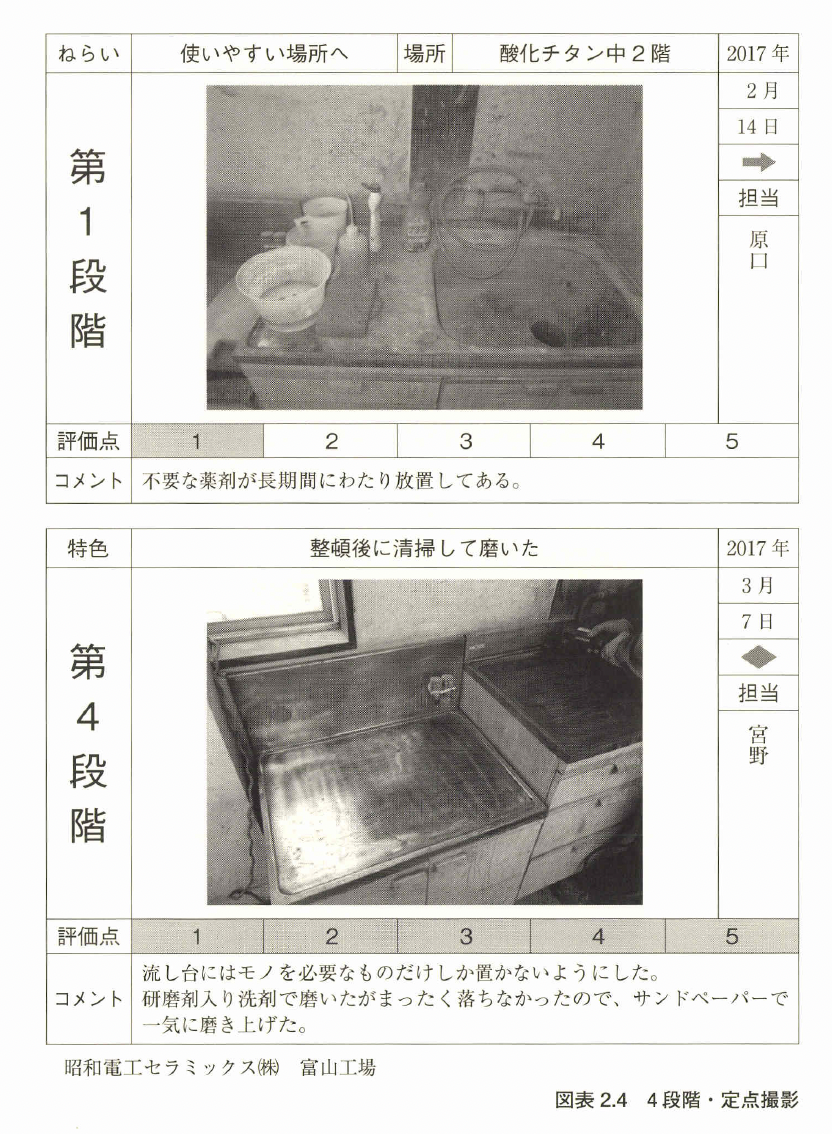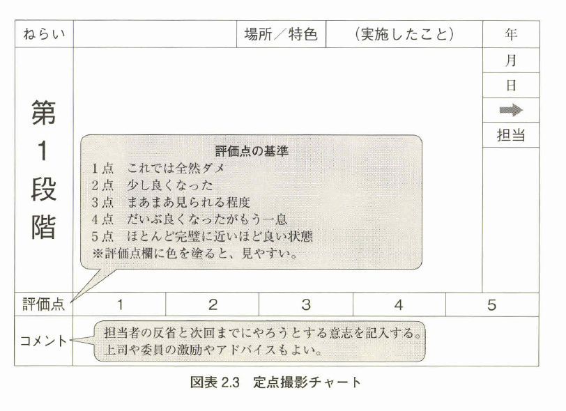 なお、図表2.4(pp.28~29)に4段階・定点撮影チャートの記入例を示す。定点撮影方式は改善の変化点が対比できなければならない。