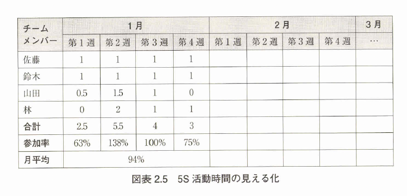 そこで5S活動に参加しているテームは活動時間を記録してほしい(図表2.5「5S活動時間の見える化」)。