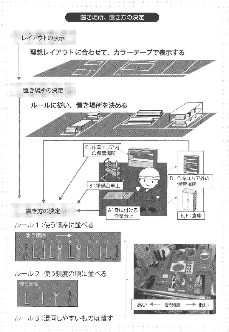 この分ける作業が大切だ。AからDエリアに置かれたモノを現場に戻す。Fエリアに置かれたモノは倉庫に持つて行く。ここまでは、わかりやすい。