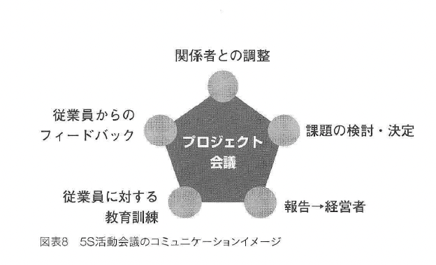 改善工程表は、リーダーやメンバーの定期的な会議で検討しましょう。活動予定の決定 や修正を行い、話し合った内容は必ずリーダーを通して経営者へ報告します。全社活動で すからこれも重要な活動ルールだと思ってください。 また、5S活動の会議の名称を決める必要があります。「5S会議」「組織活性化会議」 「5s委員会」など自社で決めればいいのですが、名称がはっきうと決まることで社内 への発信力が強ようます。事例としては『利益倍増委員会』『(組織の将来を)担う会』『こ のままで委員会』などというユーモラスなものもありました。 《準備活動のまとめ》 1 経営者が活動の目的を決定する 2 目的に沿ったリーダー・メンバーを選出する 3 リーダー・メンバーに、経営者が直接目的の意義を伝える 4 自社の「全員」を定義して「キックオフ」を行う5 活動会議の名称を決め、定期的な会議の 中で活動の工程を決める 6 会議の内容を必ず経営者へ報告し、進捗 や予定の共有を行う