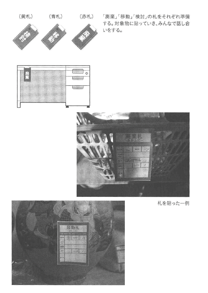 組織には、さまざまな不要なものがあふれかえっています。しかし、日常の慌ただしさ の中でそれを確認する機会がありません。もう使わない資料や古いカタログなどがいたる ところに眠っています。使えない文具やoA機器もあるかもしれません。何よりも、利 益の源泉であるはずの資材などが不良在庫化してしまっていることも珍しいことではあり せん。中には帳簿上資産として記載してあるものもあるので、勝手に廃棄するわけにはい きません。それが積み重なって不要なものが蓄積されています。 5S活動の整理では、そのような漫然とした状態を見直します。そして、活動会議や 各部署で捨てるものの基準を決めたら「赤札・青札・黄札」を貼ってみましょう。「赤 札」は廃棄していいもの、「青札」は移動したいもの、「黄札」は自分たちでは判断できな いので、責任者に決めてもらうものという意味です(91ページ参照)。 札の貼付後、部門の責任者や経営者とともに、その札の意味に応じて最終決断をします。 自分の価値観では不要なものだと思っていても、立場が違えば判断が違います。原則とし ては「捨てる」という観点から活動を行いますが、その意味やプロセスも全社で共有しま しよう。