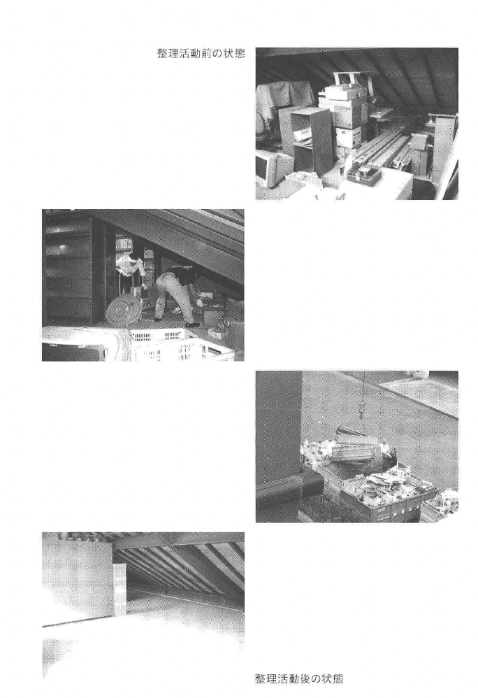5S活動で用いる「整理」という言葉は、通常の意味とは少し異なります。 一般的に整理とは「乱れているものを揃え、整えること」と理解され、机の引き出しを 整理する、倉庫を整理するなどという使われ方をします。 しかし、5S活動では「乱れている」という意味も「整える」という動作にも「個人 差」があることを前提にしています。 整理とは「不要なものを捨てる」ことです。 さて、会社の椅子に座って、あるいは工場の中や倉庫の入う口に立って、しばし気持ち を落ち着けて風景を眺めてみてください。「整理されているかいないか」ではなく、そこ にあるものが組織の活動において「必要なものかどうか」を考えます。そこから、捨てる ものの基準を決めていきましよう。