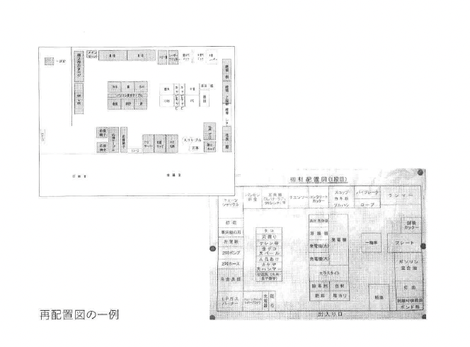 再配置図とは、その空間の目的に合わせ、効率よく動けるように人とモノの位置関係を 図面に書き起こしたものです(96ページ参照)。 机上で動ぎや型間一や ‐動一線をシ 「レー‐日υ‐「司¨配畳図「名作引J日洲「潤」判引珊d訓「国「和 境を作るために必要なプロセスです。従来の考えでは、単に置く場所の有無だけでモノを 置いていましたが、5S活動では効率性・機能性を第一に考えて、リーダーやメンバー が事前に総合的に検討します。 新たに必要な備品(棚・書庫など)が出てきた場合は、この段階で予算化して社長の承 認を得たほうがよいでしょう。