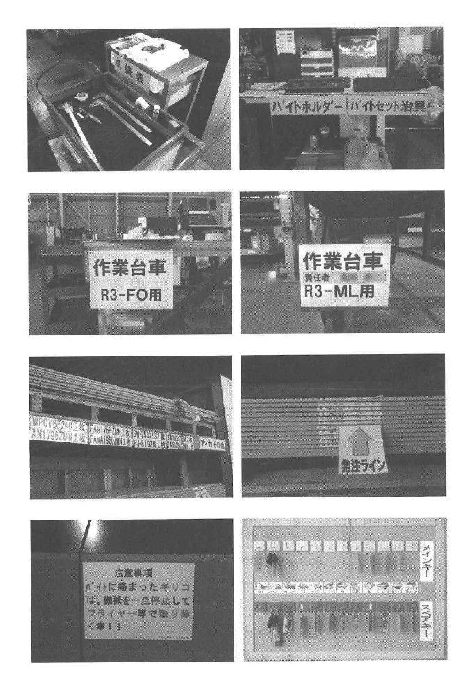 整頓活動を考えるとき大切なことは、モノの移動が終わったあとに必ず表示をすること ですc 表示の基本は「誰が見てもわかる」状態にすることです。「誰が見てもわかる」という ことは、ベテランや正社員だけではなく、新人・パート・アルバイトの人たちまで迷うこ とがなく目的の場所までたどう着けるということです。従来型の考え方では「私はわかっ ているから大文夫」「そこまで細かくやらなくてもいいじゃないか」と油断をしている部 分です。 実は、この仕組みがないために生産性が上がっていないのです。この表示活動は、次の 「清掃」に密接に結びつきます。決して手を抜いてはならないものであると理解してくだ さいc 次ベージはさまざまな表示事例の一部ですが、 一見してどのように感じるでしょう。事 例でわかるように整頓という活動には、先々の自分たちの「作業効率」「安全」「管理体 制」までも予測した全体的な視点が必要です. 整理によって不要なモノがなくなった段階で、再配置について再配置図などを元に考察 します。これは、単に部署だけで考えるのではなく工場長・生産本部長・管理部門や、場
