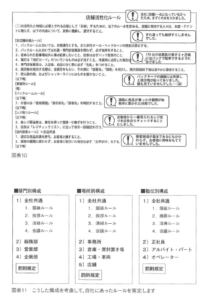 5S活動が単なる片付けで終わってしまって継続できない理由は、本章のはじめでも 書きましたが、活動の目的が明確でないことにあります。何のために新しい行動を起こすかという目的がしっかりしていない組織では、5S活動が単なる大掃除で終わってしま います。そのほかに、5S活動がなかなか維持できない理由として「ルールが不明確」 という点にもあります。いやいや細かいル‐ ノレを決めて、壁に張り出して周知を図ってい る、という組織もあると思いますが、実際に決めたとおりにできているかは、少々疑間が 残ります。 組織の仕組み構築においてもっとも重要なことは「シンプノレ」であるということです。 複雑な仕組みはなかなか定着しません。ルールがない、または複雑で煩雑すぎるために 「何をしなければならないのか」や「何をしてはいけないのか」がよく見えていない企業 も多くあります。よく見えていないために仕組みがぼやけ、精度が悪くなったり品質やサ ービスにばらつきが生じたりして、もっと得られたはずの仕事や利益を失っているにもか かわらず、失っていることや同規模の同業者と比べて利益が確保できていないことすら自 覚できない企業もあります。 同じサービスを営みながら、なぜこれほどまでに利益やプロセスや意識が違うのかと驚 くことがあります。同じ業種なのに、なぜこれほど将来に対する取り組みが違うのかと考 え込まされることがあります。この違いは、突き詰めてゆくと「組織の中のルールの違い」ということになります。やらなければならないこと、決して行ちてはならないことが 明確になっている組織は、結論として強いのです。 「会議はいつやるのか」 「原価管理はどのように行うのか」 「人材育成はどのように行うのか」 「新規事業開発は誰がするのか」 「車両管理はどのようにするのか」 これらが明確でない企業に、内部コミュニケーションの充実や利益確保、人材確保、 マ ーケティング、機材管理などができるはずはありません。 そのためにはル‐ ノレが必要です。それは、誰が読んでも理解できる、組織の従業員が loo%守らなければならないシンプルなルールです。 シンプルなルールにするため、前述したようにA4サイズ用紙で2枚以内に収まる分 量にします。それ以上のルールは組織の全員に理解されません。理解されないルールは守
