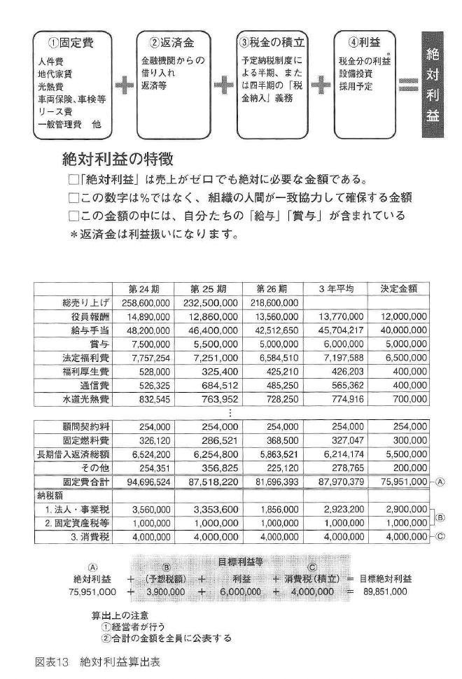 企業組織の利益の考え方にはいろいろなものがありますが、もっともシンプルな考え方 に「絶対利益」というものがあります。 組織には、仕事があってもなくても絶対に必要な金額があります。前章でも触れました が、人件費、地代家賃、光熱費、車両に関する車検や保険費用、毎月のリース費用などで す。 このような一般管理費の多くは、仕事の有無(売上の有無)にかかわらず組織にとって は絶対に必要な金額です。その金額に金融機関からの借入れの返済金額、予定納税の金額、 そして1年の組織活動を通して経営者が必要であると考えている利益を加えます。 その金額の総額を組織全体で集めると、企業は絶対につぶれません。企業が倒産する理
