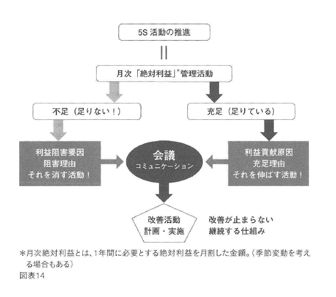 5S活動と絶対利益管理が連動するようになると、会議の内容が変わります。 多くの企業組織の会議は、単なる報告会で終わっているケースが少なくありません。生 産工程、安全、改善などの会議を行っても、上からの通達や活動実績の報告で終わる例が 多いようです。組織内で共有すべき原因追求に関しての議論が進まないのは、やはり基準 となる目標が明確になっていないからです。 しかし、5S活動を構築した組織に絶対利益管理を組み合わせると、「利益阻害要因」 「利益貢献要因」という新たな視点が生まれてきます。 ・利益阻害要因 目標とした月間絶対利益が確保できなかった理由のことです。 仕事の種類、販売・製造プロセスの不備、コミュニケーションの不足、連絡体制の不備、担当者の経験不足、協力会社のミス、組織内の連携不足などがあります。 ・利益貢献要因 目標とした月間絶対利益が確保できた理由のことです。 仕事の種類、協力会社の優秀性、 コミュニケーションのよさ、担当者の能力向上、組織 内の連携体制の向上など・ (注)月間絶対利益とは、年間の絶対利益金額を12 カ月で割ったものです。 この利益阻害要因と利益貢献要因は、獲得した絶対利益金額の過不足で判断することが できます。不足していたときには阻害要因、充足していたときには貢献要因について話し 合います。その中では「伸ばすべき要素」「禁止、あるいは修正すべき行動」「すぐにでき ること」「時間をかけるべきこと」などについての話し合いが活発化します。その結果を 受けて、それらの活動を行うべき責任者定め、活動の工程などを協議します。 このように、5S活動と絶対利益管理は組織にとって車輪の両輪のような機能を果たし、 会議の内容まで大きく変える可能性を持っています。