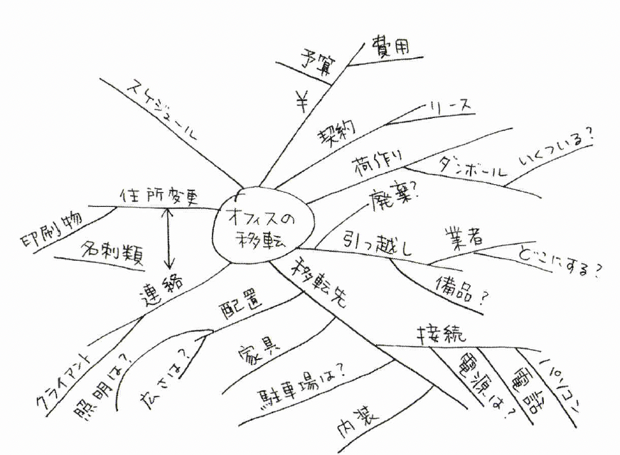 たとえばオフィスを移転する ことになったら、パソコン、新しい名刺、いろいろな配線の変更、新しい家具、電話の変更、不 用品の処分、箱詰めなどを考えつくだろう。こういった考えを図にしてみると、左ベージのようになる。
