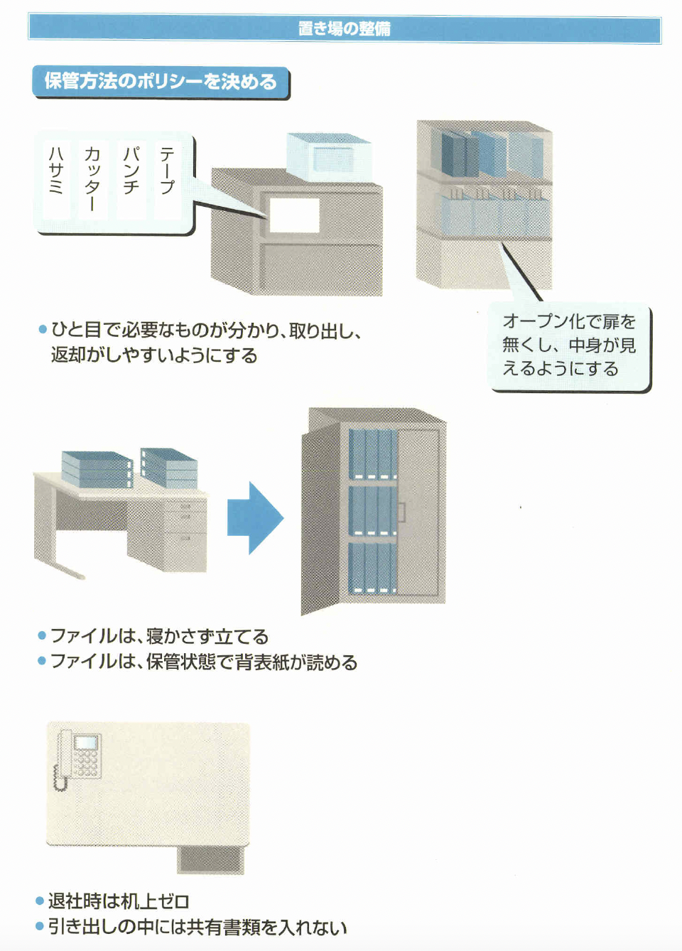キャビネット=日常的に使用する共用のもので、棚に置けないもの・鍵つきキャビネット=使用者を制限する機密資料、個人情報が記載された書類など③フロアー内の棚・キャビネット・棚=定期的に使用する共用のもので、立てて置くことができるもの。