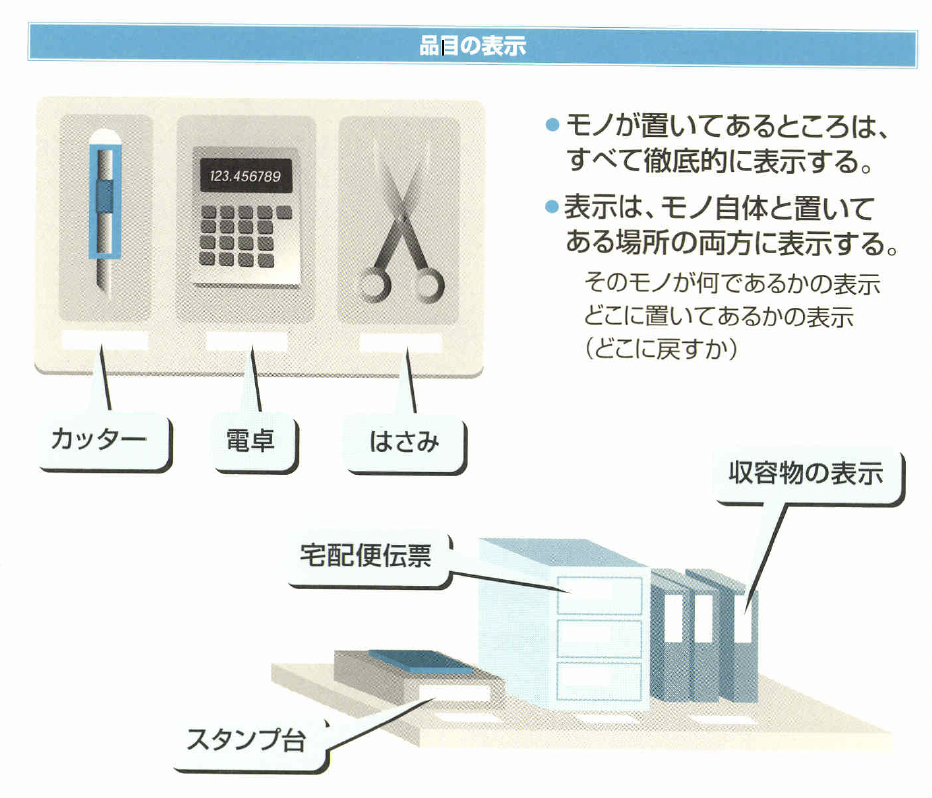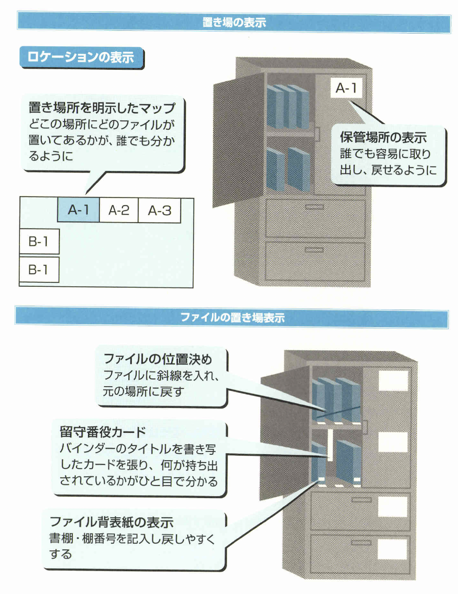 ①ロケーションの表示・棚やキャビネットなどの位置が言葉だけでイメージできる表示をする例えば、3F東2(3階の東側の壁の2本目の棚)・棚やキャビネットに直接表示して周知する・必要に応じてレイアウト図上に保管場所を明示し周知する②必要に応じて収容物のグループ表示色を棚やキャビネットにも明示する③管理責任者(部門)の表示・棚。
