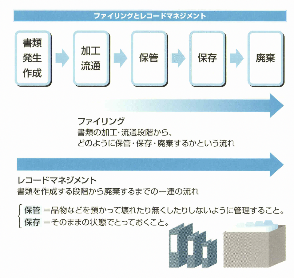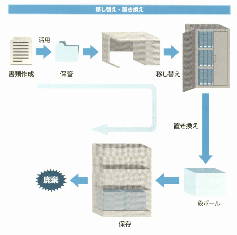キャビネット=定期的に使用する共用のもので、棚に置けないもの④同一建物・敷地内の倉庫・書庫・棚=年に数回しか使用しない、または使用の予定がないもので、使用時にすぐ取り出せる必要があるもの・キャビネット=棚に置くものと同様のもので棚に置けないもの・鍵つきキャビネット=使用予定のない機密資料・ダンボール箱=使用する可能性がなく、法規制などにより保持することが求められているもので、廃棄時はそのまま捨てられる状態で保存したいもの
