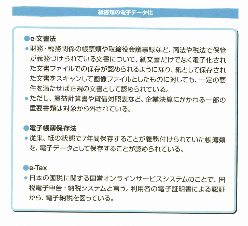 電子データ化に関しては、e‐文書法や電子帳簿保存法などがあり、文書の法定保存期間は、以下の通りです。