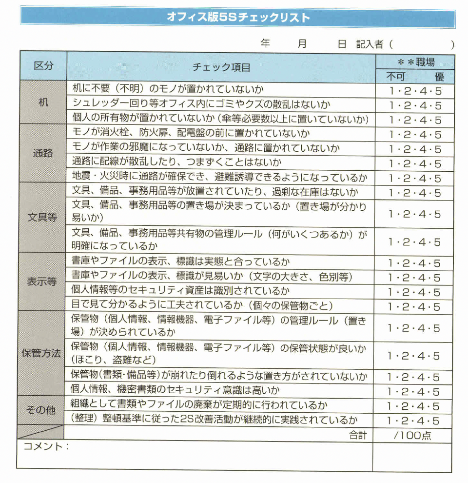 自主点検の際には、オフイス版5Sチェックリスト(チェックシート)を用います。