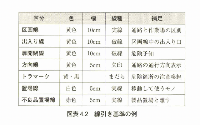 ただし、移 動するモノの置き方を標準化するために線を引くのであって、移動しないモノに置場線を引く必要はない。