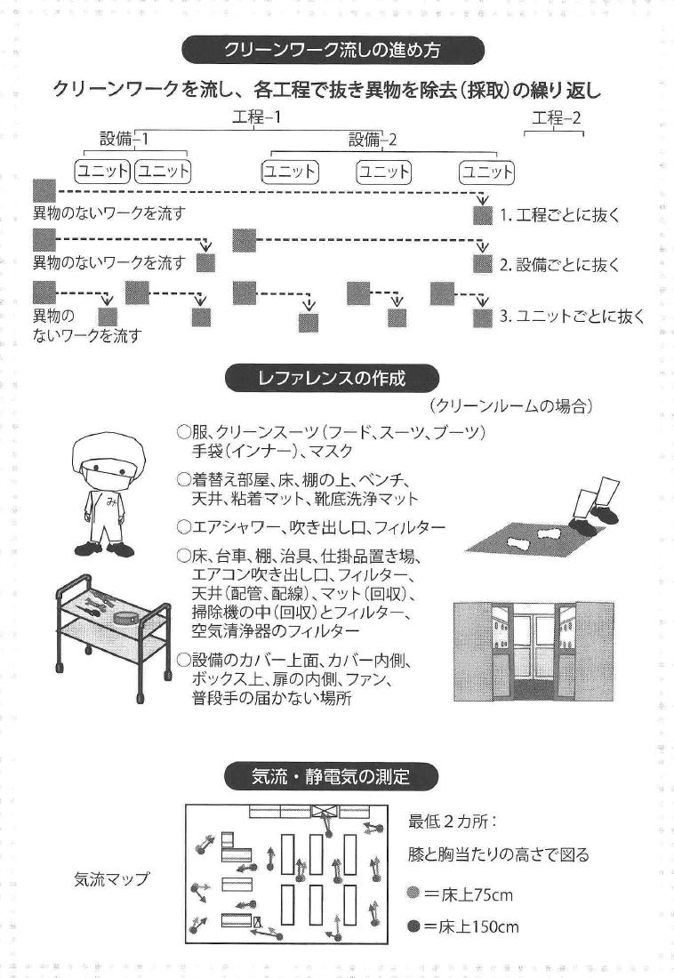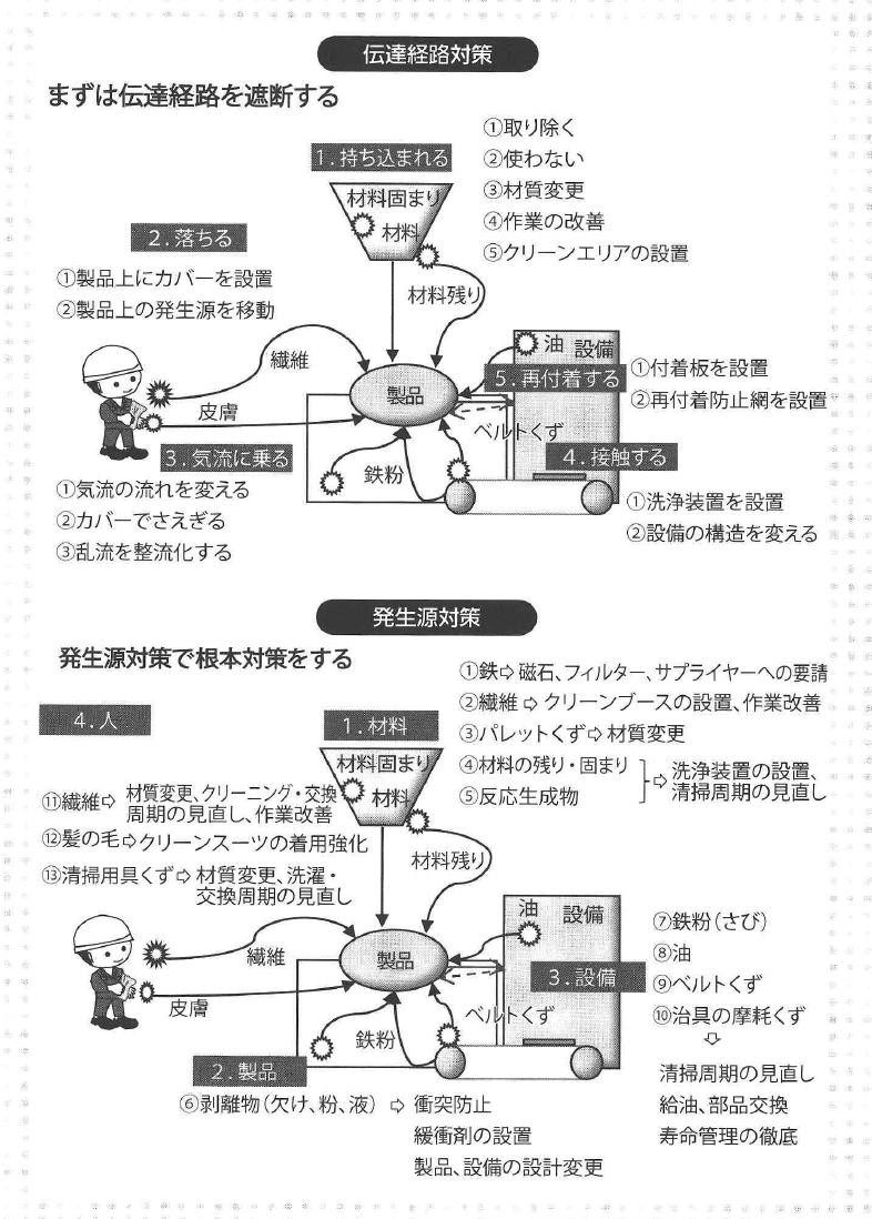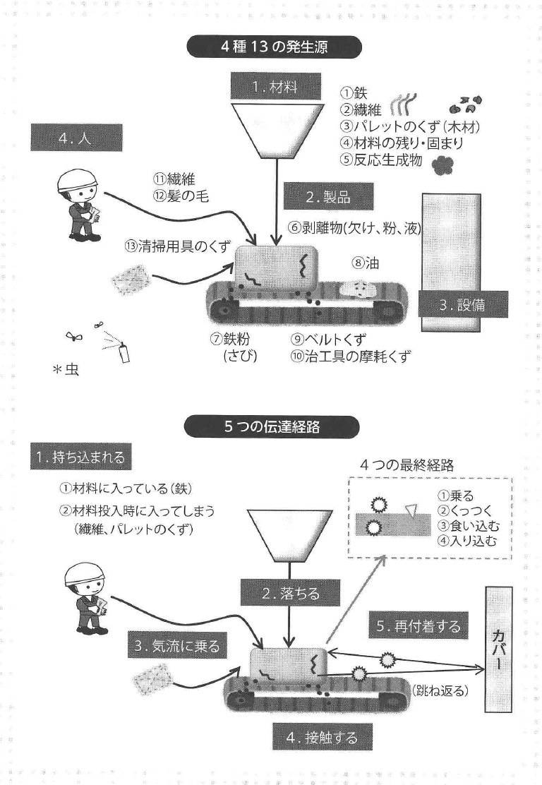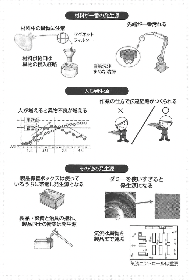 材料残り、 反応生成物、製品の割れや欠け、設備からの鉄粉、油、治具のくず、繊維、清 掃用具のくず、皮膚などはすべて異物です。