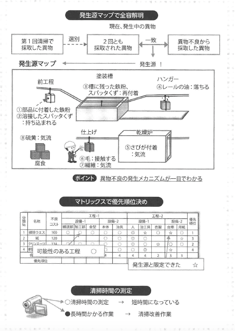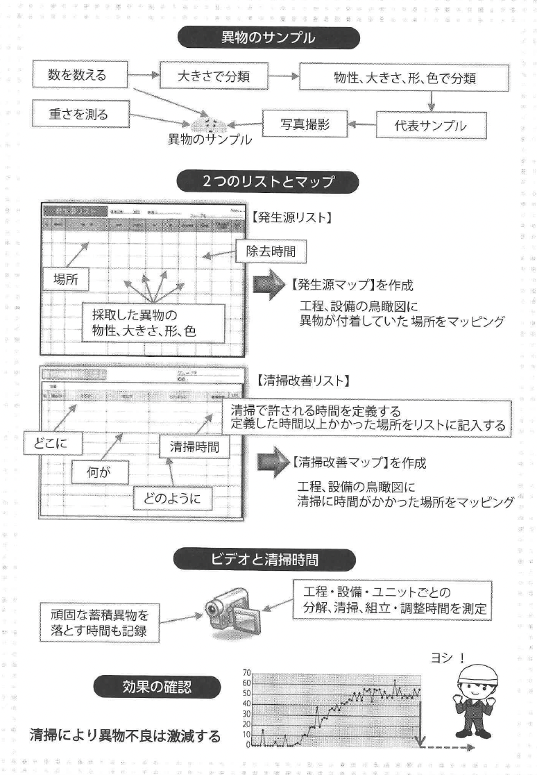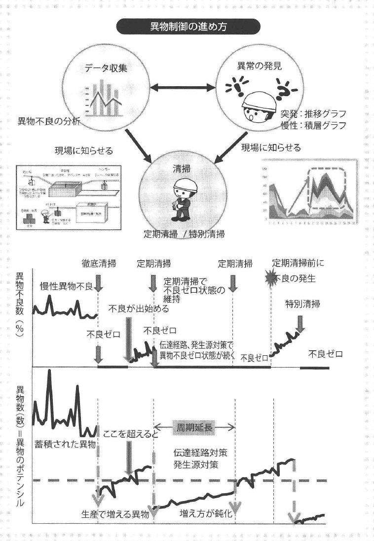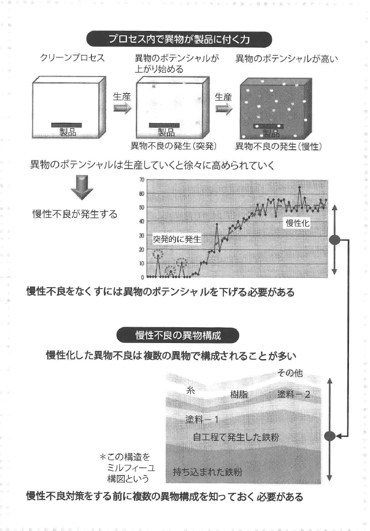 その段階で発生源に対して清掃しないと、異物はプロセス内に蓄積さ れ続け、異物不良が増え続けます。
