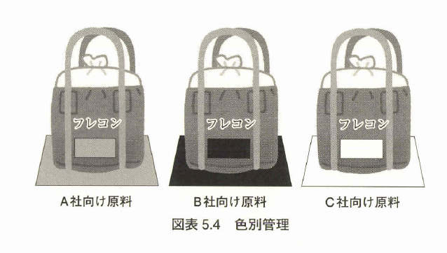 (1)原材料の色別管理 原材料の違いによる不良が発生しないように、原材料置場とフレキシブ ルコンテナバッグ(フレコン)に色を塗って表示する(図表5.4)。