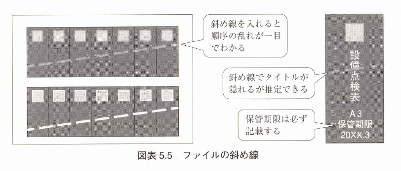 簡易版として保管期限と序 列表示のための斜め線をいれるという背表紙基準を設けるという方法もあ る(図表5.5)。