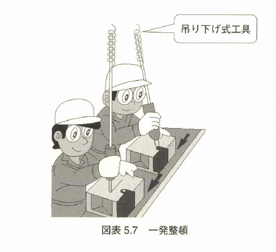 バ ネの力でもとの位置に戻る吊り下げ式工具などを用いて、作業を終えて手 を離すと、一発で工具が元に戻るようにすると楽である(図表5.7)。
