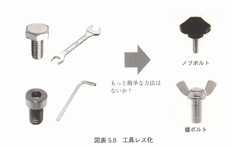 回す工具とネジ類を組み合わせたような、ノブボルトや 蝶ボルトを活用すれば工具レス化できる(図表5.8)。