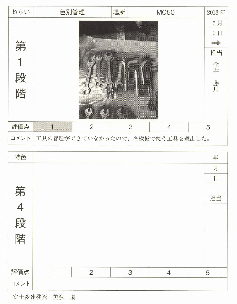 例えば押出工程の工具は緑、射出工 程の工具はピンクというように決めればよい。