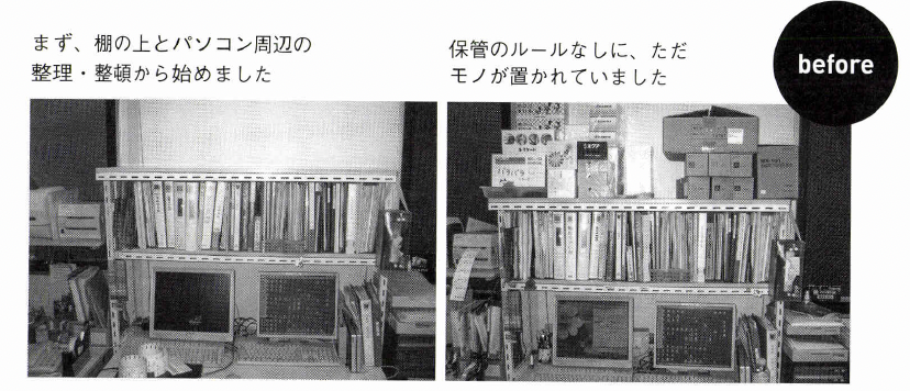 まず、棚の上にはモノを置 一かないように決めました。棚 の上、パソコン周辺を整理・ 整頓して、不要なモノを廃棄 しました。廃棄した分で収納 スベースが確保できました。