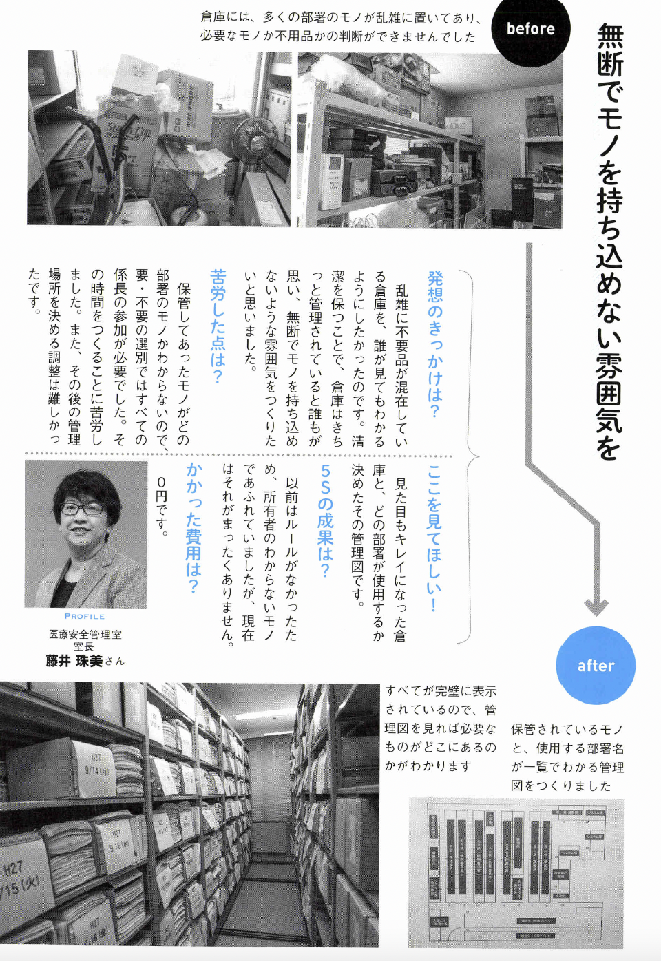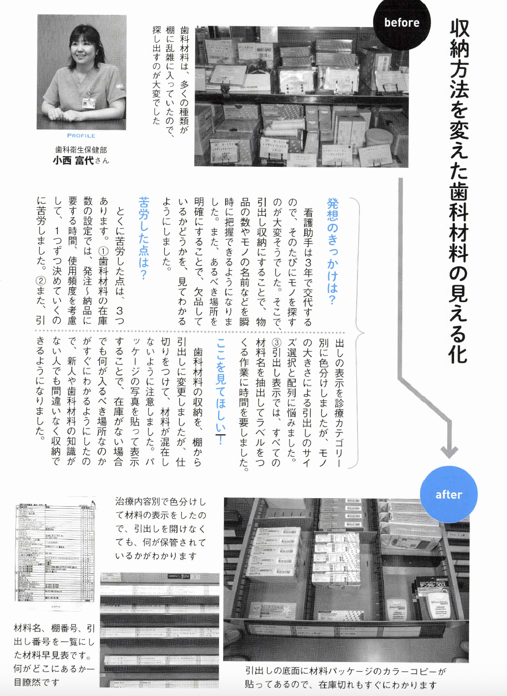 改善したかった困リゴトは? 歯科材料の収納棚には「いつか 使うかも」「急に必要になったとき 困る」「捨てるのはもったいない」 といった不良在庫が大量にありま した。 頻繁に使う材料もかなりの在庫 数があり、モノがあふれている状 況でした。また、収納場所が点在 していたこともあり、必要なモノ を探すのに時間がかかっていまし た。 どのように進めたの , 徹底的に整理をしました。まず 必要・不要に分けて、不要と判断 したものは責任者が確認して、処 分または他部署での再利用品とし ました。それによって在庫量が大 幅に削減できたので、収納棚を廃 棄し、スペースが確保できました。 そこで、動線を考えた収納に変更 できました。 また、看護師、歯科衛生士、看 護助手それぞれが現状の問題点を 出し合って、どう改善するかをみ んなで検討しました。整理・整頓 を実施するにあたっては、5Sリ ーダーがつくった綿密な計画をも とに役割分担し、全員で実行しま した。 苦労した点は? 多職種がかかわる場所なので、 歯科材料などの知識に差があって、 配置の決定には苦労しました。ま た、女性がほとんどという部署な ので、大きなモノの移動は大変で した。 どうやって打開したの? 歯科材料などの配置については、 歯科衛生士がリーダーとなって決 定しました。また、力仕事は他の 部署や5S推進委員会の委員に手 伝ってもらいました。 5Sの成果は? 歯科器材・材料の在庫量を見直 し、定数を減らしたことで、モノ の整理・整頓がしやすくなり、整 頓の状態が維持しやすくなりまし た。 また、収納方法を棚から引出し に変更したことで見やすくなり、 モノを探す時間が短縮され、在庫 量の管理もしやすくなりました。 さらに、歯科材料の保管スベー スが減少して棚を廃棄できたので、 新たなスペースが生まれ、それを 有効活用することができました。 棚卸実施者数は、3人から2人 に減らすことができ、業務改善に つながりました。 こうした経験によって自分たち の業務を見直し、改善する習慣が つきました。多職種で話し合う機 会も増え、連携が取りやすくな∪ ました。