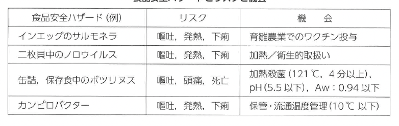よつて,牛の内臓肉に含まれる0157,鶏肉・鶏卵に含ま ねるカンピロバクター・サルモネラ,青魚加工の不備によつて発生するヒスタミ ン(ヒスタミン産生細菌のヒスチジン脱炭酸酵素による反応)などの物質を「食品 安全ハザード」といい,それらの細菌類によつて引き起こされるかもしれないそ れぞれの疾病現象などが「リスク」である。