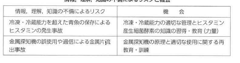 余談:門外漢であるが,アノ原発事故は,原子炉の冷却不能による「リスク 及び機会」を,知的集団の企業がどこまで考慮したのであろうかつ 例えば,電気機能不能緊急時の液体窒素や液化炭酸ガスの投入設備の付設な ど・・・・ 【参考解説】 「リスク」と「食品安全ハザード」と「機会」 「食品安全ハザード」は,健康への悪影響をもたらす可能性がある食品中の生物 的,化学的もしくは物理的物質と定義される。