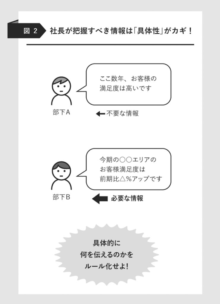 ◆全情報を共有したら、社長もナンバー2も潰れる社長とナンバー2の情報共有はもちろん大切です。情報開示の点で、武蔵野は原則フルオープンです。会社の数字であれ、セクハラ問題であれ、すぐに全社員に広がります。しかし、何もかも共有するかといえば、そんなことはあり得ません。ここで重要なのは「どんな情報を共有して、どんな情報は共有しないのか」がはっきり決まっていることです。私が知り得ている情報のすべてをナンバー2の矢島に伝えます。その中には矢島が担当している組織、事業とは無関係のものも含まれる。無関係の情報まで共有したら、途端に矢島はキャパオーバーになります。だから、ナンバー2が担当している組織、事業に関する情報はすべて伝えますが、無関係のものは伝えないです。「誰にとって、どの情報が必要なのか」あるいは「必要ないのか」が明確に区別されていることが重要です。これは「社長↓社員」という方向に限らず「社員↓社長」についても同じです。武蔵野では、ナンバー2をはじめ、すべての幹部、社員が「何を、どう社長に報告するのか」、反対に「何は報告しなくていいのか」がはっきり決まっています。これが決まっていない会社がものすごく多いです。しかし、考えてもみてください。従業員八〇〇人が毎日メールを一本私に送ったら、それだけで私はパンクします。だから、私には「上位二〇パーセントのお客様の情報をあげる(それ以外はシャットアウトする)」と決めています。売上げの八〇パーセントは上位二〇パーセントのお客様によって成り立ち、社長は、重要なことを把握できれば十分です。「知らない幸せ、知ってる不幸」も会社にはある。◆「固有名詞のない報告」は必要ない!社長、上司への報告にしても「ただ報告すればいい」ではありません。私は「固有名詞のないものは報告しなくていい」と指導してます。「社員の小貫悦子課長が『ある男性』と歩いていた」なんて情報はいらないわけです。「ある男性」が誰だかわからなければ、そんなものは作文と同じです。そんな情報が社長にあげられたところで、時間の無駄です。ただし、「社員の小貫悦子課長が日下部綾馬課長と歩いていた」なら話は別です。これは報告すべき内容となります。このように業務に関しても「何を、どのように報告するのか」がきちんと決まっている