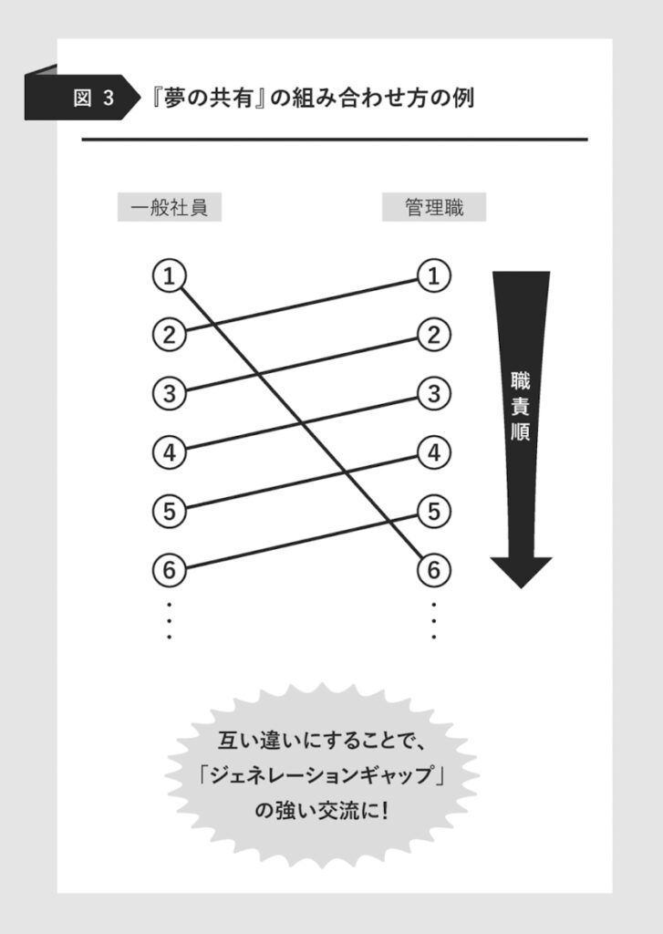 す。自腹で行く分には、誰と何回飲みに行こうが自由ですが、会社のお金で飲みに行く場合は、平等に飲みに行くことが原則。そこは「順番に飲みに行け」です。部下が一人しかいない場合は「上司との飲み会は三ヶ月に一度」と決めています。部下は、上司とのサシ飲みを毎月やっていたら、身が持ちません。そこのところを考慮して「三ヶ月に一度」となっている。こうやって一つ一つ決めれば、嫌でも上司は部下を連れて飲みに行きます。基本的に二次会は禁止です。二次会が認められている懇親会も明示してある。このルール化が何より大事です。上司と一対一で飲みに行けば、普段会社ではできない話もしますし、お互いのことを理解することもできます。それで何か不都合なことがあれば、その都度ルールを変えればいいです。◆「ジェネレーションギャップを埋める飲み会」を実施さらに、武蔵野では『夢の共有』と名付けられた「ジェネレーションギャップを埋める飲み会」制度もあります。部署はまったく関係なく、まず右側には部長からズラッと職責順に、そして左側には、平社員を立場が上の人間から順に並べます。この二つのリストで「職責の高い人」と「平社員」を互い違いに組ませて二人で飲みに行くしくみです。ここでのポイントは「五〇代と二〇代が飲みに行く」と年齢差が生まれたり、「まったく違う部署の先輩・後輩と飲みに行く」ことが実践される。年齢差のある人同士(そして、関係ない部署の人同士)が飲みに行くと、ごく自然に仕事の悩みが相談できたり、自分が若い頃の会社のことなどを話す機会が生まれます。直接の上司から聞くより、これが案外、すんなりと聞けるなのです。そもそも、ジェネレーションギャップを常に感じていると人間は耐えられませんが、たまにだと心地いいものです。特に上司の元上司や上司の同僚の話は絶対に聞けない話が飛び出てくるから満足度は大きいです。これは海外旅行とまったく同じで、文化や風習の違う地域へ行くと、その違いがけっこう楽しいものです。しかし、そこで二年間暮らせと言われたら、ストレスになる。人間とはそういうものです。『夢の共有』も、そんな人間心理に即している。毎週となったら苦痛ですが、年に二回ならお互いけっこう楽しいもの。その席で思わぬ本音や家庭で抱える悩みなど、普段は話しにくいことを話し合えます。世代間のギャップが生じている会社にとっては、とてもいい方法だと思います。しかし、これも「ルールとして決まっている」ことなくして、絶対に実現しません。ここまで徹底するから、しくみが活きてくる。飲み代は会社持ち。こういうところをヘタにケチると、しくみがうまく機能しません。限られたお金をどこに使うか。こういうところにも社長の手腕が現れる。